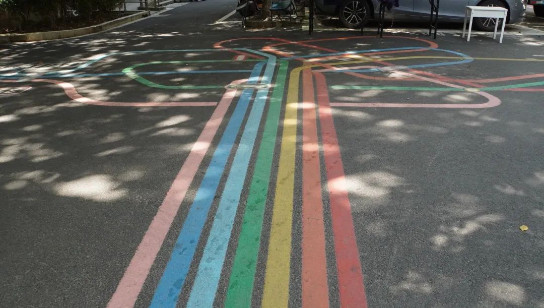 从福泉路大门踏入淞虹公寓小区,最夺人眼球的就是脚下拥有彩色线条的主干道。红橙黄绿青蓝紫7种不同颜色的线条从大门口一直延伸到前方的T字型路口,结成类似中国结的“七彩树”,再由此“开枝散叶”伸向小区各个角落……