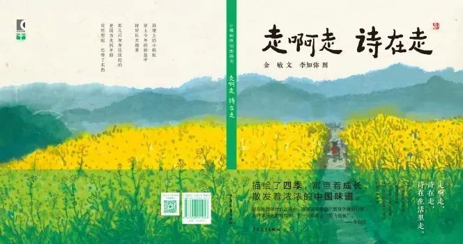 《走啊走 诗在走》描绘了四季,寓意着成长,散发着浓浓的中国味道。全书的内容按照春夏秋冬的顺序编排,寓意着年复一年、周而复始、万物生长。在这本书里,我们可以“读”到春天的小鸟、毛毛虫、油菜花、蔷薇花、麦田,“读”到夏天的狗尾巴草、菖蒲、蜻蜓、荷叶、池鱼、泥鳅,“读”到秋天的云朵、银杏、桂花、柚子,“读”到冬天的雪、筷子、椅子、饺子……“读”到春生、夏长、秋收、冬藏——春天萌生,夏天滋长,秋天收获,冬天储藏,这是中国传统农业生产的过程,也比喻着事物发生、发展的过程。