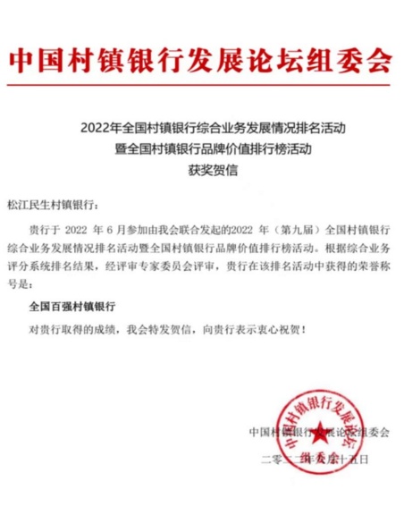 近日,上海松江民生村镇银行在2022年(第九届)全国村镇银行综合业务发展情况排名暨全国村镇银行品牌价值排行榜活动中荣获“全国百强村镇银行”称号,系连续四年获此荣誉。