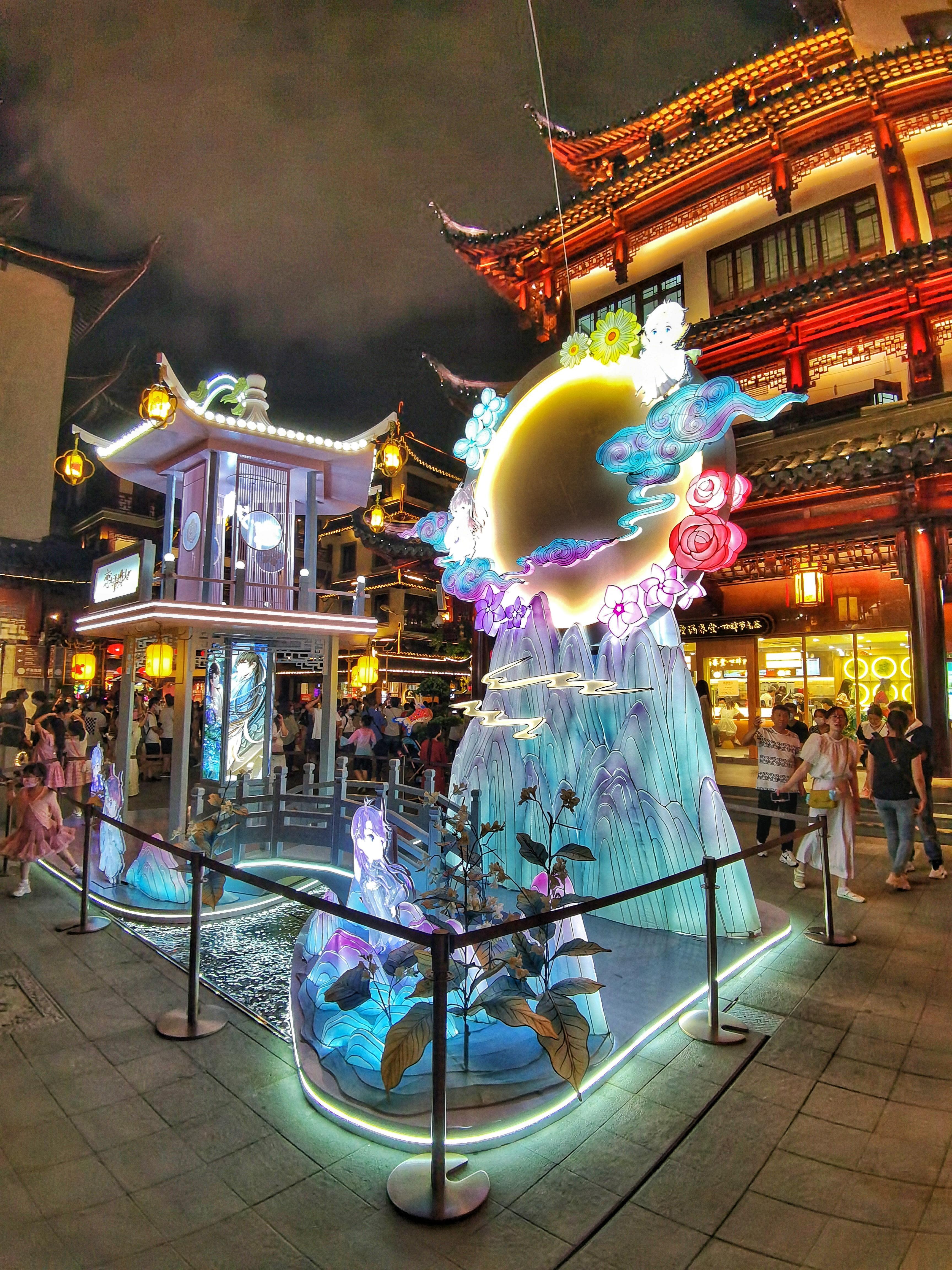 在豫园中心广场,一轮大大的明月悬挂在空中,一座小桥与凉亭静静地矗立在一旁……搭配上特殊的灯光效果,让人仿佛置身广寒宫的亭台楼阁,引得不少人拍照打卡留念。