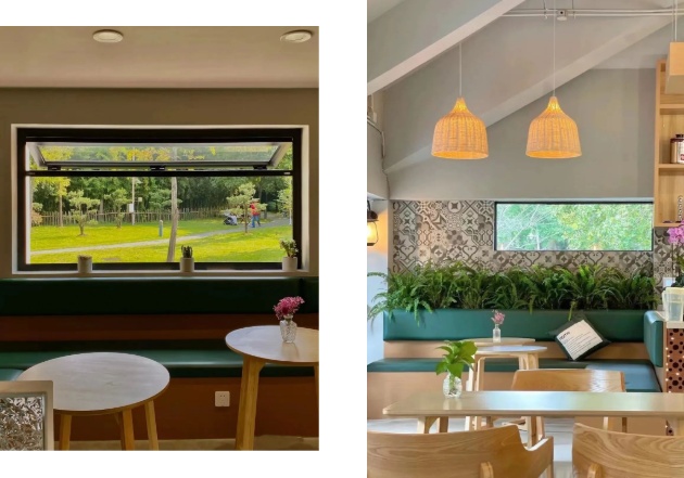 室内的空间宽敞明亮,咖啡馆成了整个公园的最佳观景台。每一扇窗都是一个风景画框,框进一片草、一片天、一棵树,很有电影感。