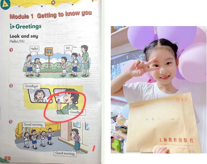 妈妈穿着绿色短袖送孩子上学,在挥手告别时,短袖却变成了长袖……牛津上海版一年级英语教材课本中出现前后矛盾的画面,被长宁区绿苑小学的周郁文发现了,向出版社反映问题后,出版社不仅第一时间给周郁文回信,在今年的新一版教材中,还及时将错误进行了修正。