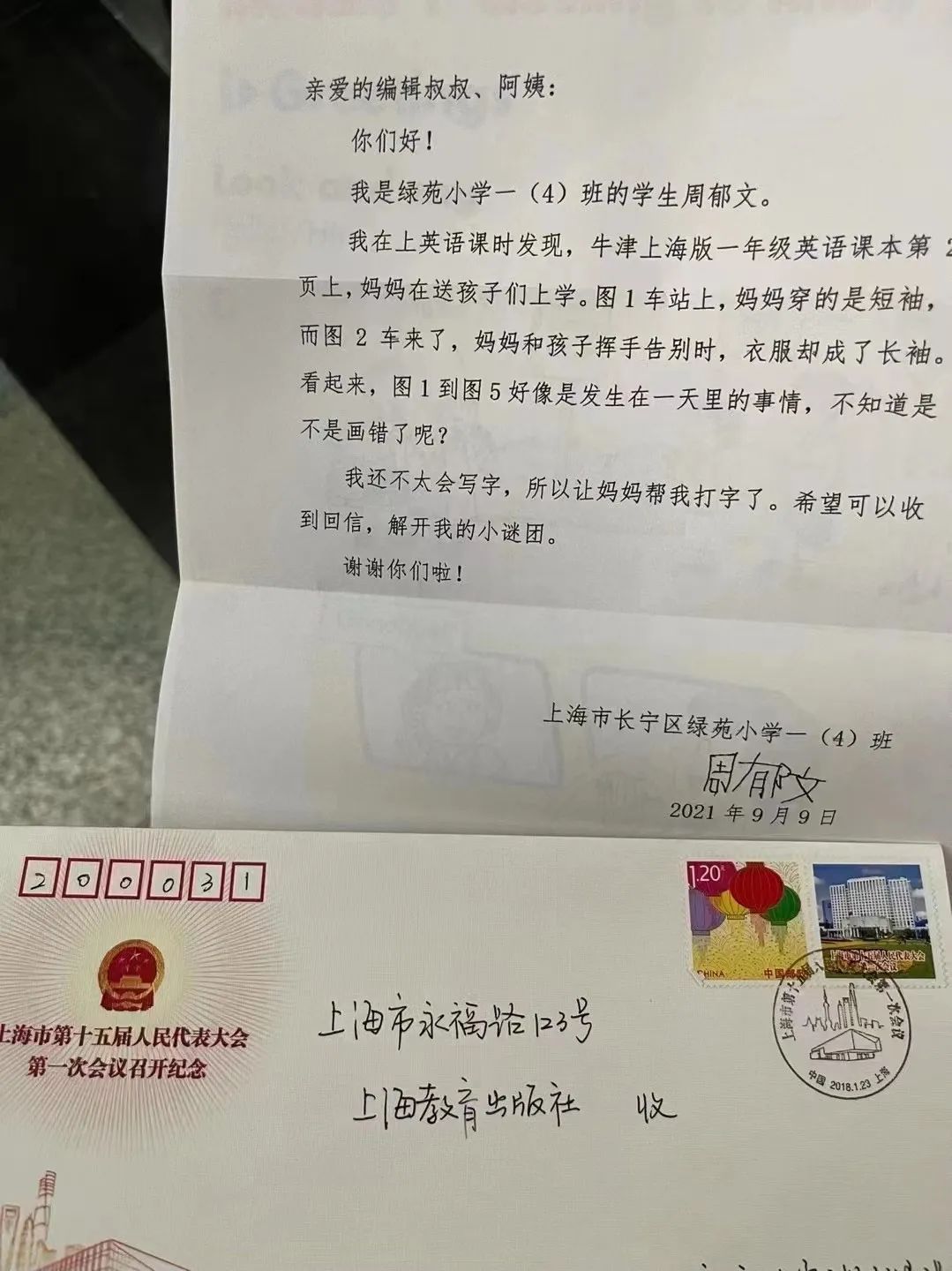 事情要从去年9月说起,当时周郁文还是一个刚入学不久的一年级新生,有一天在上英语课时,偶然发现了书本中的短袖问题,回来便告诉了妈妈。看似小小的无关紧要的问题,但周郁文决定向出版社提出“质疑”。在妈妈的帮助和鼓励下,她随即给出版社寄出了一封信。在信中她这样写道:“牛津上海版一年级英语课本第2页上,妈妈在送孩子们上学。图1车站上,妈妈穿的是短袖,而图2车来了,妈妈和孩子挥手告别时,衣服却成了长袖。看起来,图1到图5好像是发生在一天里的事情,不知道是不是画错了呢?”