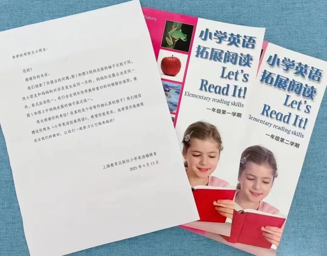 没有想到,短短几天后,上海教育出版社给这位“明察秋毫”的小同学回了信,并赠书给周郁文肯定了她的质疑精神,还表示会在第二年秋季教材重印的时候修改插图,使妈妈衣服的袖子款式统一。