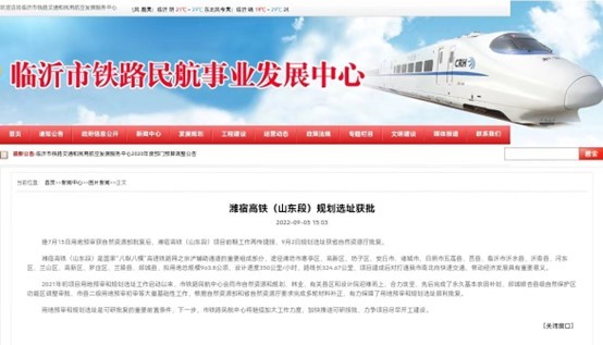 9月5日,临沂市铁路民航事业发展中心发布消息:继7月15日用地预审获自然资源部批复后,潍宿高铁(山东段)项目前期工作再传捷报,9月2日规划选址获省自然资源厅批复。