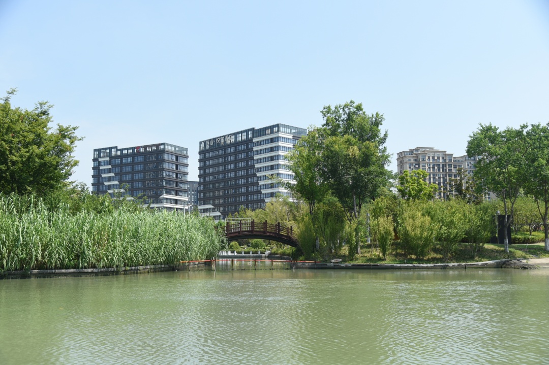 从永靖路南侧环城河绿带出发,一路往西,环城河河面宽阔,碧波荡漾。放眼望去,两岸绿意盎然,高楼耸立,深厚的文化底蕴与繁华的都市美景融为一体,移步皆是景色。环城河南侧为嘉定老城区,北侧即为菊园新区。作为上海唯一保存完好且依旧具备实用功能的古代护城河道,6.5公里长的嘉定环城河如今已成一处文化标志水岸,串联起了沿岸公园绿地。