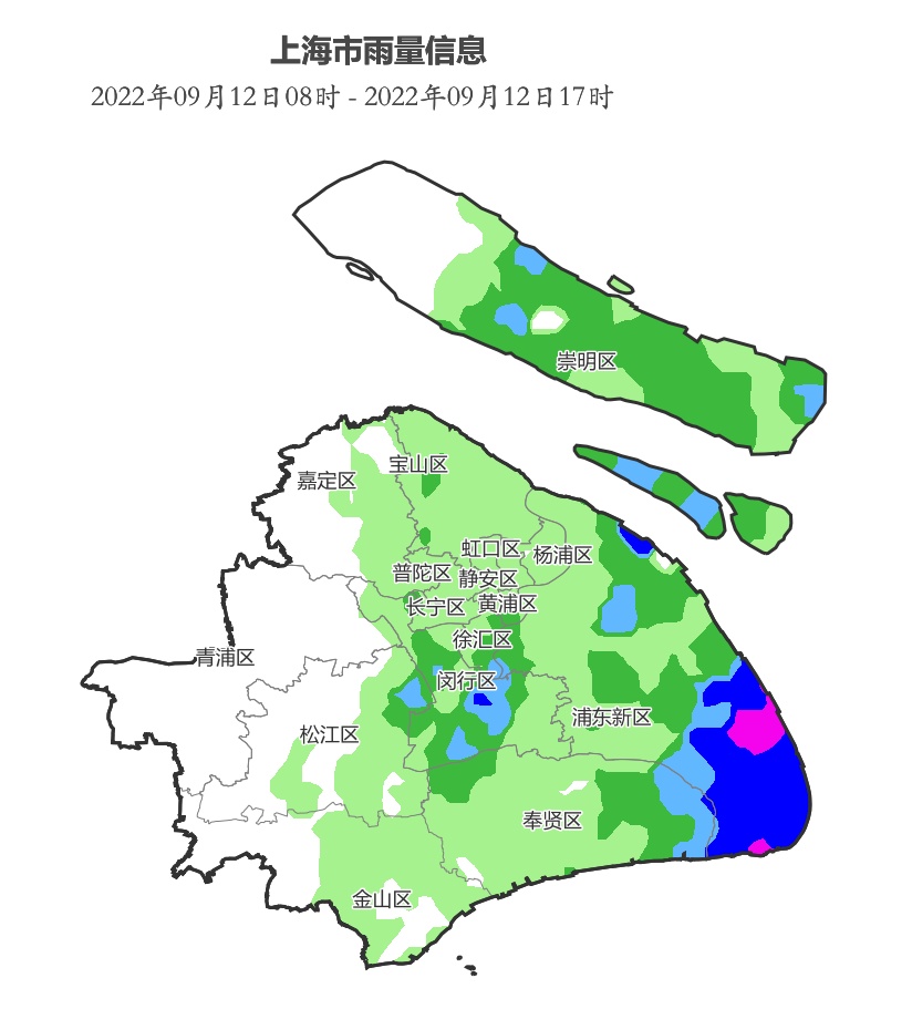 受台风“梅花”倒槽云系影响,全市大部分地区出现阵雨或雷雨的天气,上海中心气象台先后发布了雷电黄色和暴雨蓝色预警信号。截至12日17时,全市雨量分布不均,降水主要集中在浦东、崇明、奉贤和闵行等地。