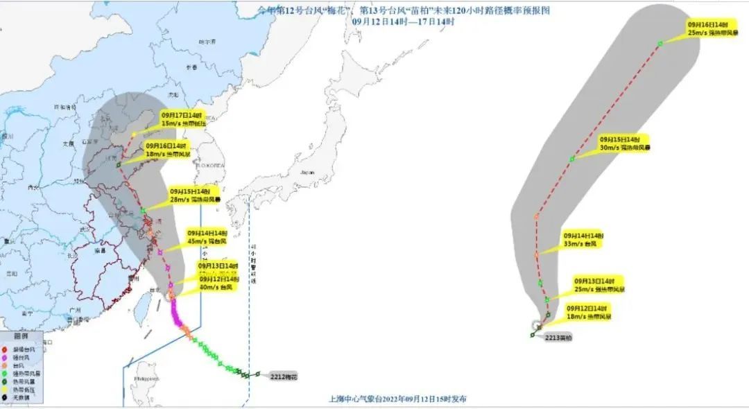今年第12号台风“梅花”(台风级)12日下午16时位于浙江省舟山市南偏东方向的东海海面上,中心附近最大风力有13级,中心最低气压为960百帕,七级风圈半径220~260公里。