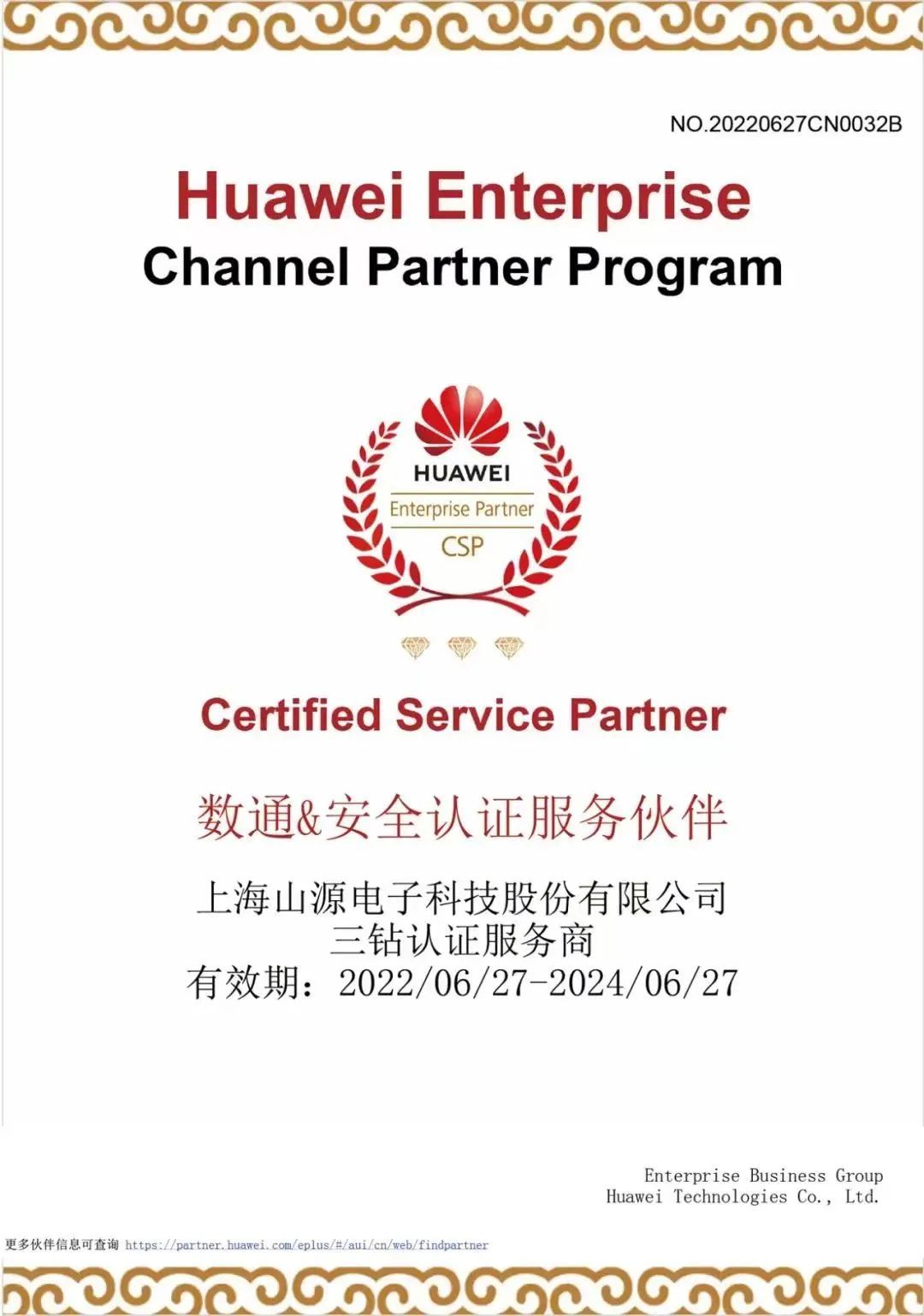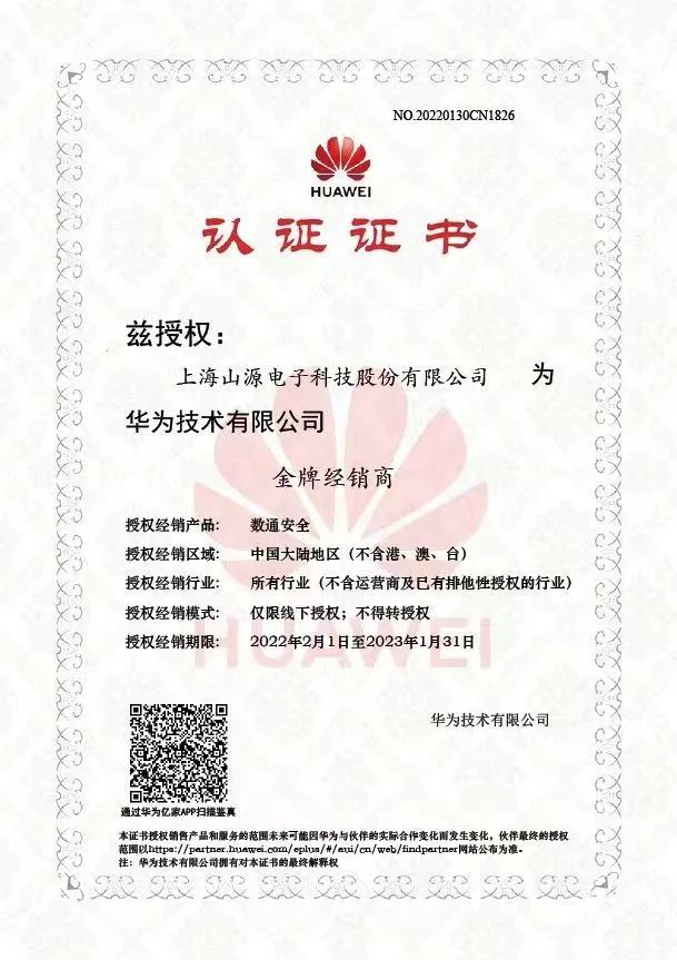松江企业上海山源电子科技股份有限公司日前成功通过“华为数通&安全认证服务伙伴三钻服务商”的考核,顺利成为华为数通安全金牌经销商。