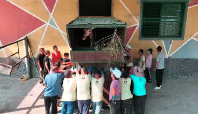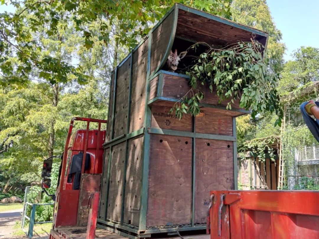 在日常的饲养管理中,铲屎官就会和动物们进行定位、跟随等日常的行为训练,建立信任与合作,以便配合健康监测、笼舍调整等工作。而要让“姗六”乖乖进入运输笼,则要比日常行为训练稍复杂点。首先,得让“姗六”熟悉运输笼,方法不难,但需要耐心。铲屎官会将运输笼放置在后场,让它自己看看、闻闻,慢慢接受这3米高特殊“装置”。然后,在铲屎官的指令下,“姗六”需要学习进出运输笼,并自愿在笼内安心采食铲屎官准备的树叶。过程中,铲屎官还会循序渐进弄出不同的声响,让“姗六”习惯各类运输途中可能出现的声音,避免应激。最后一步,就是轻轻把门关上了。