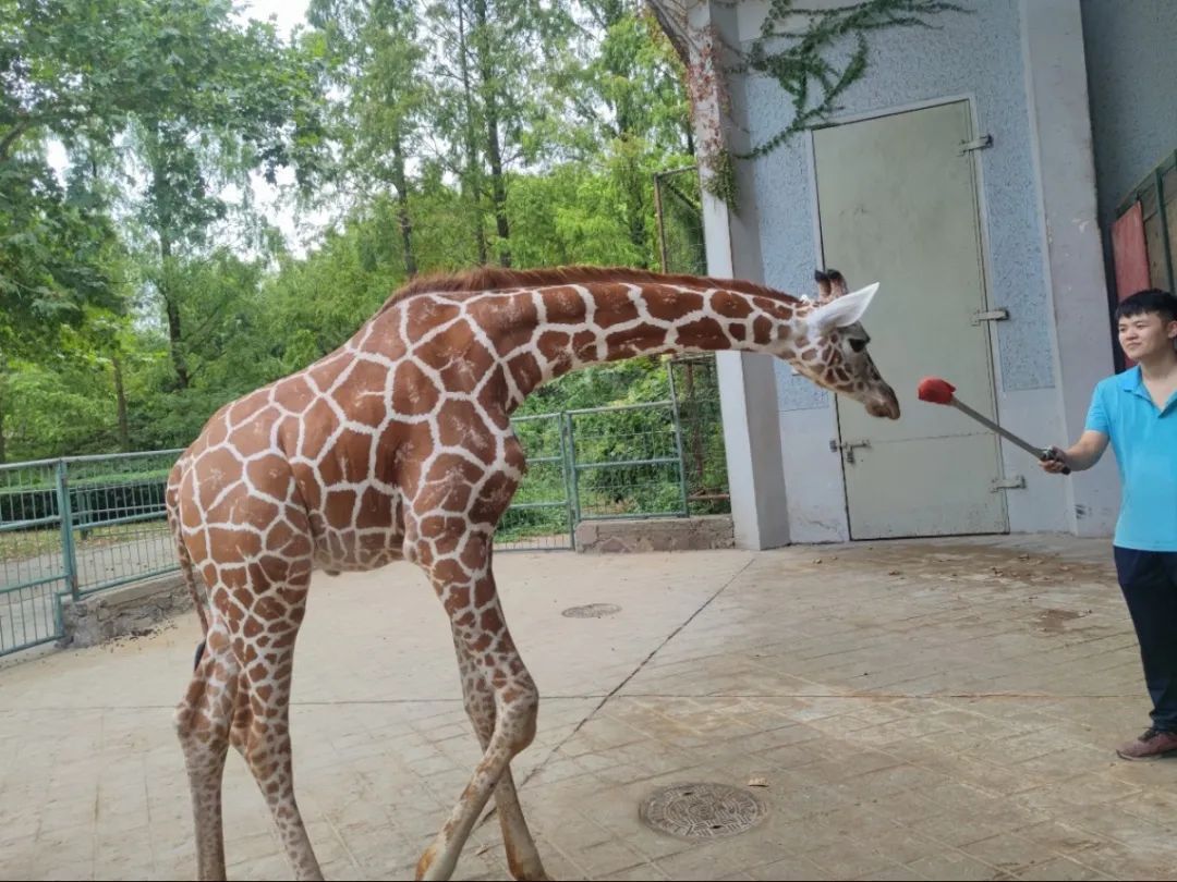 长颈鹿修长有力的脖子、四肢都是抵御外敌的重型武器,一旦受惊应激可能开启奔跑模式,所以不能使用拉网、套绳等保定其他食草动物的方法。并且,长颈鹿和大多数食草动物一样,天生敏感,平日里,即便是铲屎官即将出现在长颈鹿视野前,也需要咳嗽一声或者用脚发出摩擦声,提示它们“有人来了”。所以,行为训练是长颈鹿进出运输笼最安全有效的方法。