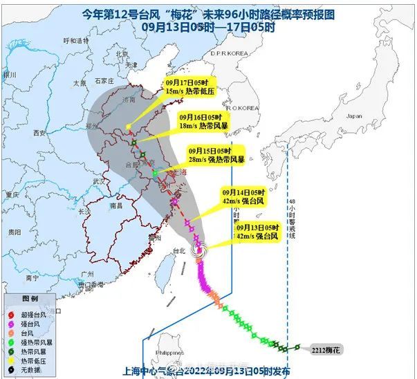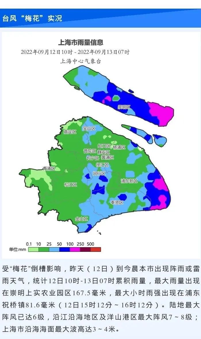 上海市气象局发布:预计,“梅花”将以每小时10~15公里的速度向偏北转西北方向移动,逐渐向浙江温岭到舟山一带沿海靠近,并将于14日下午到夜间在上述沿海地区登陆,登陆后“梅花”将继续向西北方向移动,强度逐渐减弱。受“梅花”影响,13日本市有大雨到暴雨,局部大暴雨。本市最强风雨影响时段出现在14日下午到15日上午,大部有暴雨、局部大暴雨,陆地最大阵风7~9级,沿江沿海地区10~12级,洋山港区和上海市沿海海面12~14级。