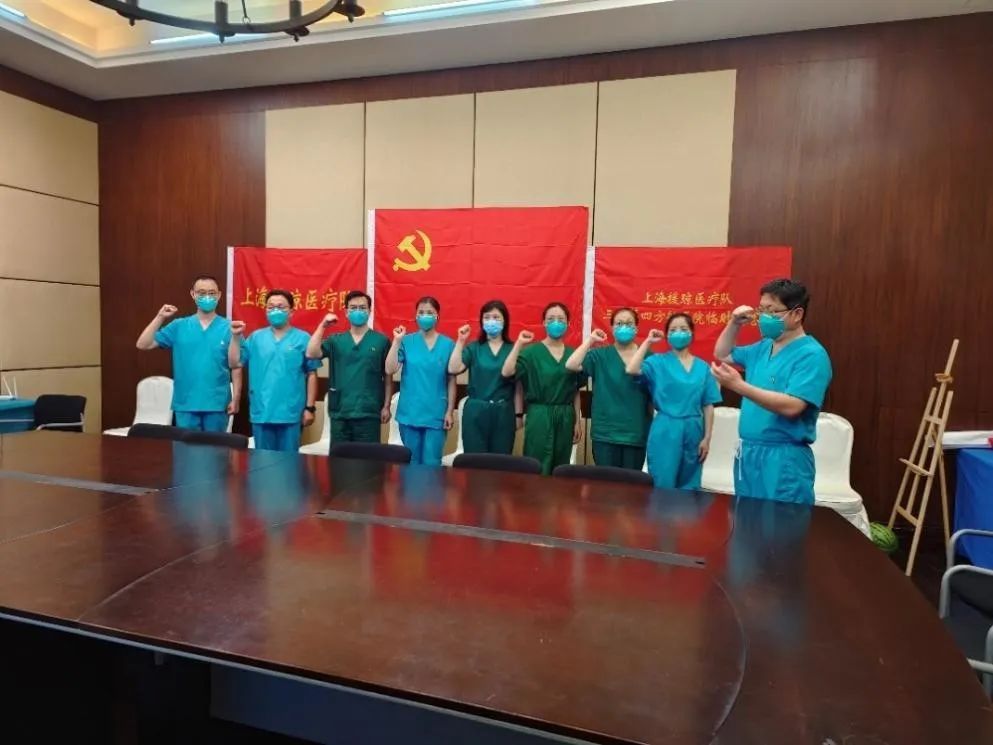 李新平同志作为同济援琼第二医疗队临时党支部书记,组织队员们共同开展3次主题党日活动、1次医师节活动。期间李新平同志带领党员们重温入党誓词。在鲜艳的党旗下,全体党员重温入党誓词,始终不忘党员身份,不忘入党时全心全意为人民服务的初心,坚守自己的初心使命。队长李健同志反复强调,抗击疫情最吃劲的时候,思想上不能掉以轻心,我们需要规范诊疗流程,注意动态观察方舱内患者的生命体征,早期识别急危重症,防患于未然。援琼期间9位队员提交入党申请书,党员同志们以身作则,凡事冲在前面,让党旗在抗疫一线高高飘扬。