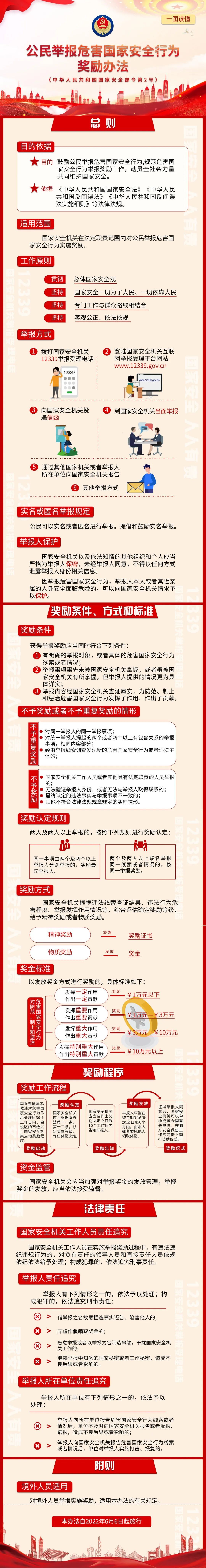 为了凝聚起维护国家安全的全民力量,2022年6月6日,国家安全部发布规章《公民举报危害国家安全行为奖励办法》(以下简称《办法》),并自公布之日起施行。