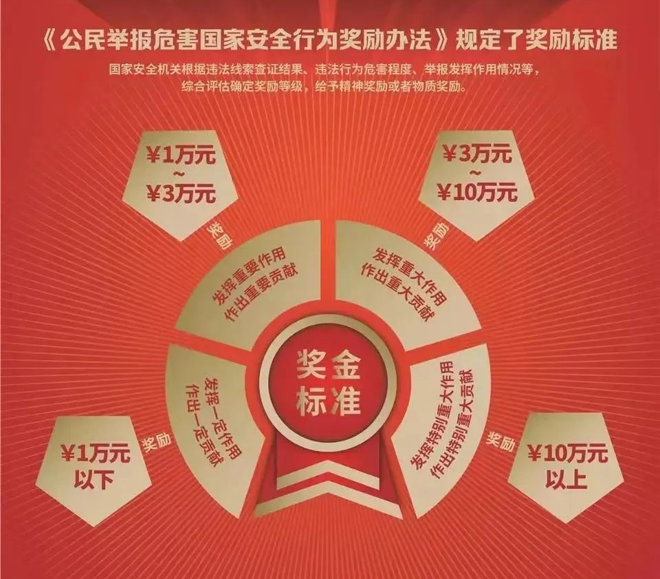 《办法》细化和明确了国家安全机关实施举报奖励的条件、方式、标准和程序,在奖励标准中,根据举报发挥作用程度、作出贡献大小,划定了4个等级,最高奖金超过10万元。