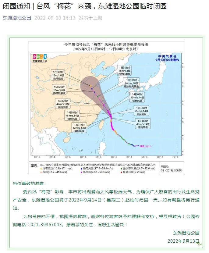 应对台风“梅花”,上海地铁全面进入临战状态,提前预警、快速响应。届时,将根据台风走向及对运营造成的实际影响,视情对地面高架段采取列车限速或停运的安全管控措施。请乘客关注“上海地铁shmetro”官方微博、“Metro大都会”App等推送的实时信息,及时调整出行路径。
