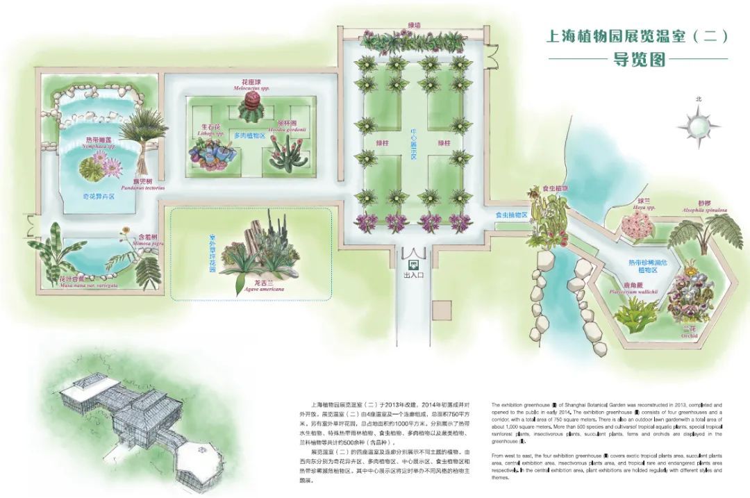 展览温室(二)的导览地图上可看到4座温室及连廊分别展示不同主题的植物: