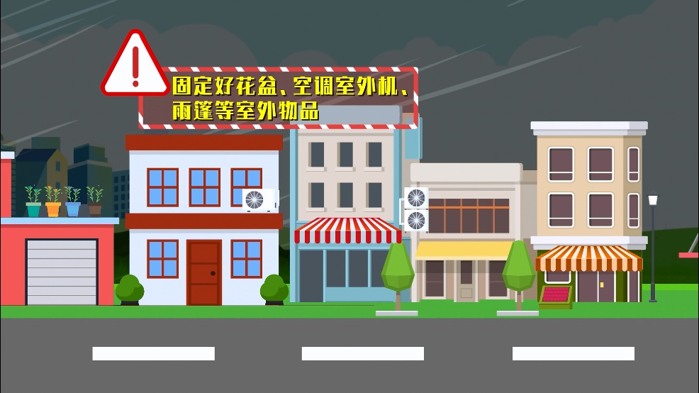 4、加固或者拆除易被风吹动的搭建物;外出人员避免在玻璃门窗、危棚简屋附近及广告牌等高空建筑物下面逗留。