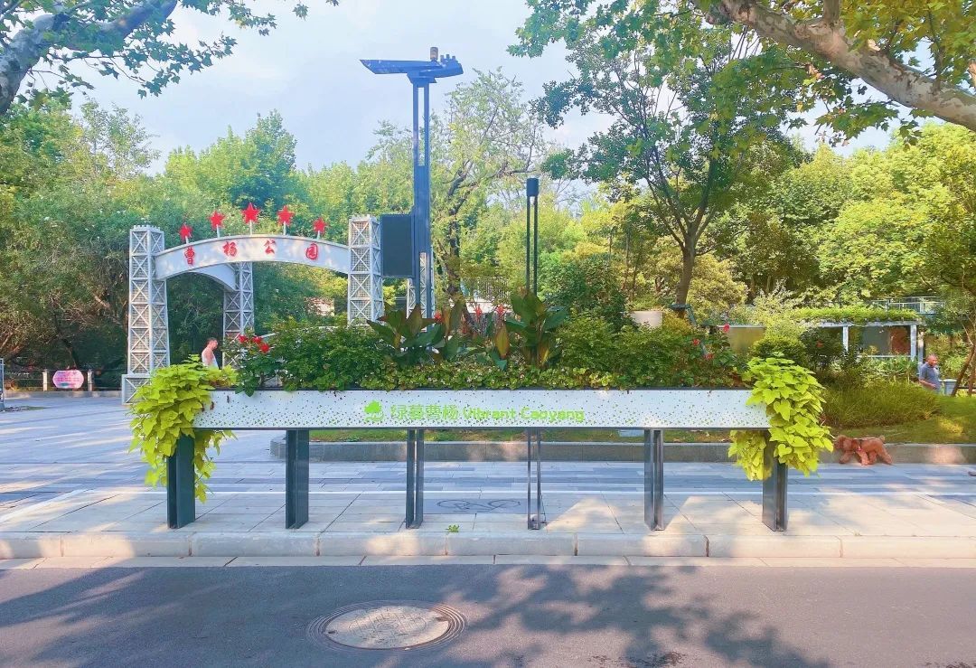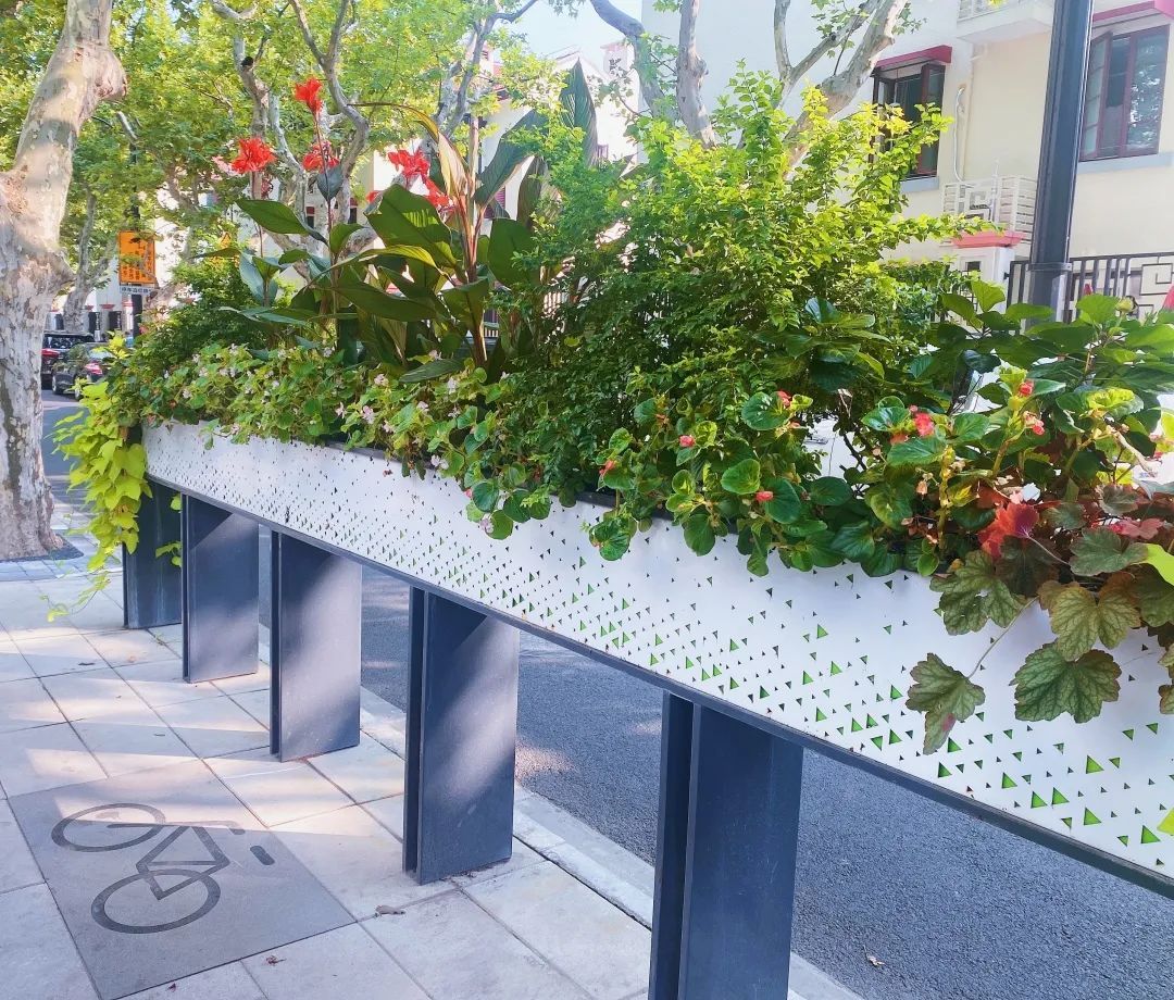 据介绍,为合理组织非机动车停放,引导市民绿色出行,用“绿蔓曹杨”的花坛点缀非机动车停放点。