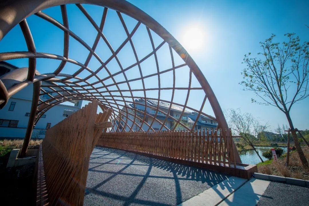 弯篓桥和鱼篓桥,仿照农家竹编鱼篓,设计了弧形的上盖,枝条横蔓、野趣盎然,又充满了现代感。