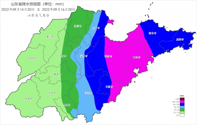 预计14日夜间到16日,山东大部地区有明显降雨。全省累积平均降水量40—60毫米,其中,青岛、烟台、威海、日照、东营、淄博、潍坊和临沂50—100毫米局部200毫米以上;滨州、济南、泰安、济宁和枣庄20—40毫米局部50毫米以上;其他地区5—15毫米。