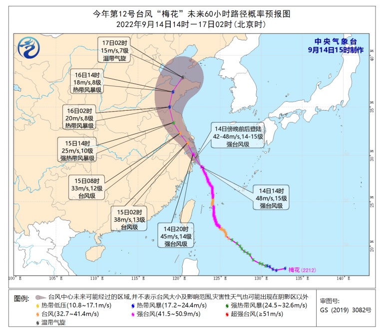 根据山东省气象台14日下午发布的台风“梅花”路径信息,今年第12号台风“梅花”14日15时中心距离浙江省象山县东南方向约80公里,中心附近最大风力15级(强台风级),中心气压945百帕。
