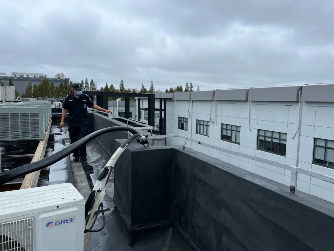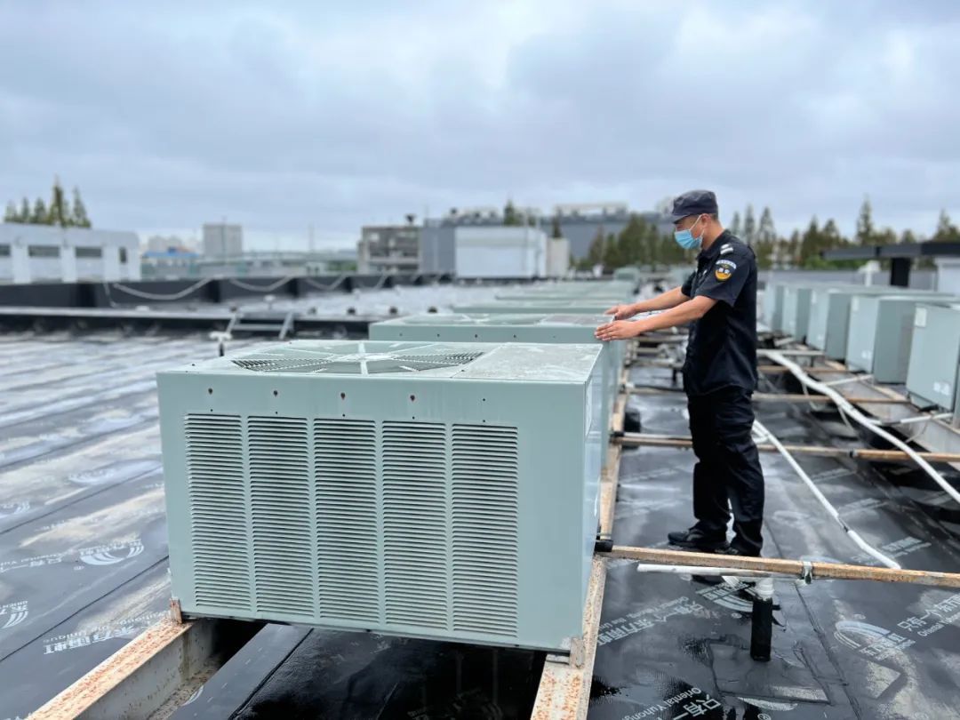 在楼顶天台上,刘先洋挨个儿检查了空调外机的牢固程度,并确认了新风系统的正常运行。“主要防止台风来了以后,把那些设备刮坏。”刘先洋说,“这一方面是对机器的保护,一方面也确保这些‘空中设备’不会被吹落,造成人员损伤。”