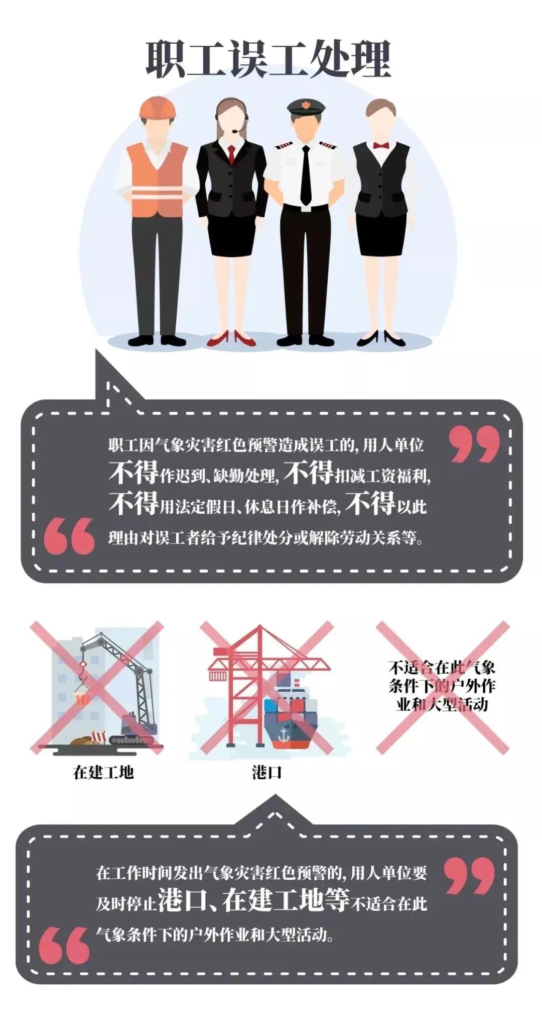 应当上班而不能按时到岗的职工,要及时与本单位联系。职工因气象灾害红色预警(指发布台风、暴雨、暴雪、道路结冰等红色预警)造成误工的,用人单位不得作迟到、缺勤处理,不得扣减工资福利,不得用法定节假日、休息日作补偿,不得以此理由对误工者给予纪律处分或解除劳动关系等。