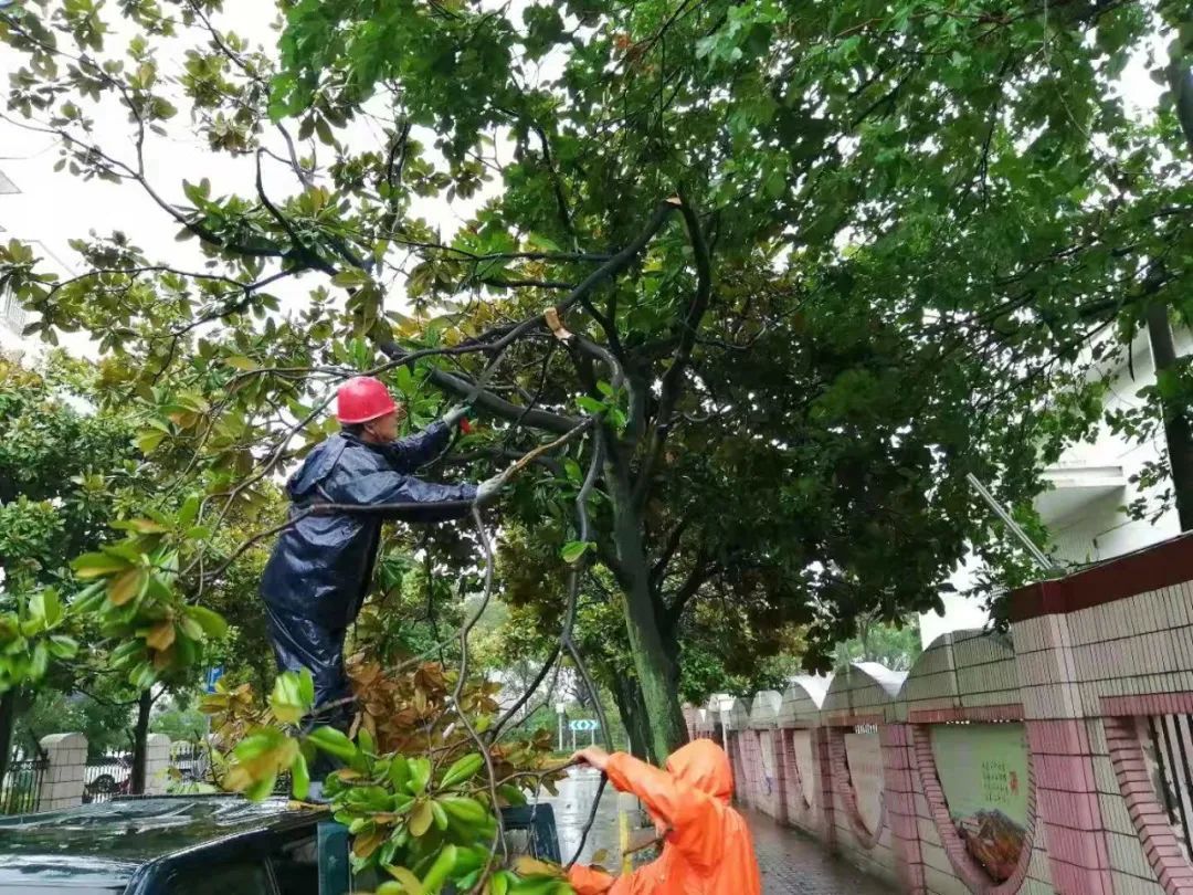 嘉定工业区叶城绿化公司对道路两侧部分根系较为薄弱、树干较为单薄的树木以及倾斜树木进行四角支撑加固工作,为行道树修剪疏枝,减小行道树吃风面积,并安排人员24小时值守,加强道路绿化巡查力度和次数,截至目前已出动20多人次,对霍城路、阳川路等路段的倒伏树木、折断的树枝进行紧急处理。