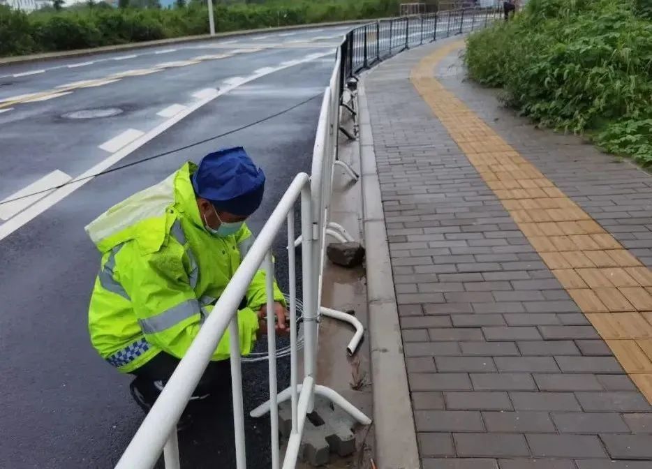 马陆镇联勤队员对常态化核酸采样点位的护栏进行加固,及时消除安全隐患。