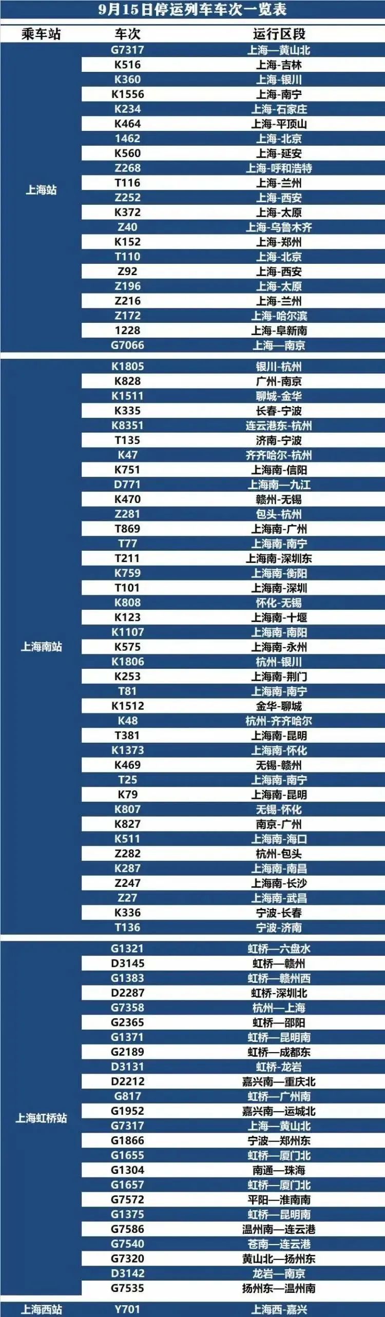 受台风“梅花”影响,截至9月14日上午11时,铁路上海站(下辖上海站、上海南站、上海虹桥站、上海西站、安亭北站、南翔北站、安亭西站)部分列车停运,具体车次见下表。