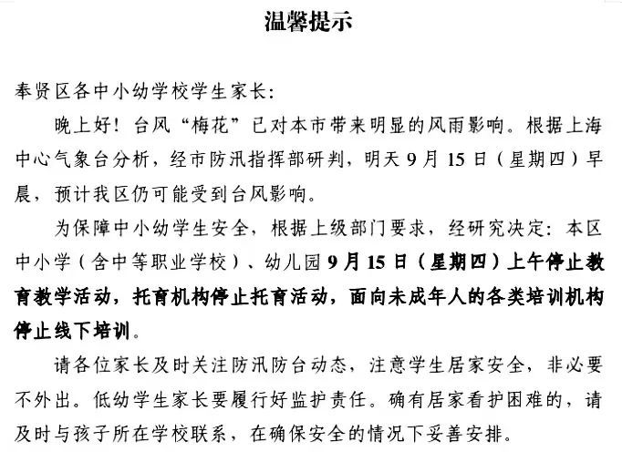 9月15日下午,奉贤区各中小幼学校是否开展教育教学活动,将由各校自行决定,请各位家长留意班级群组通知。