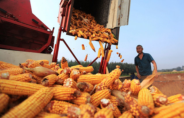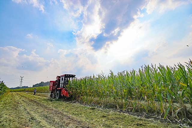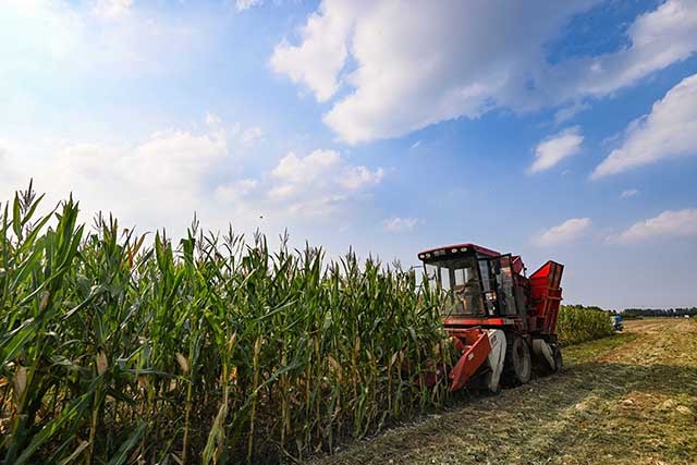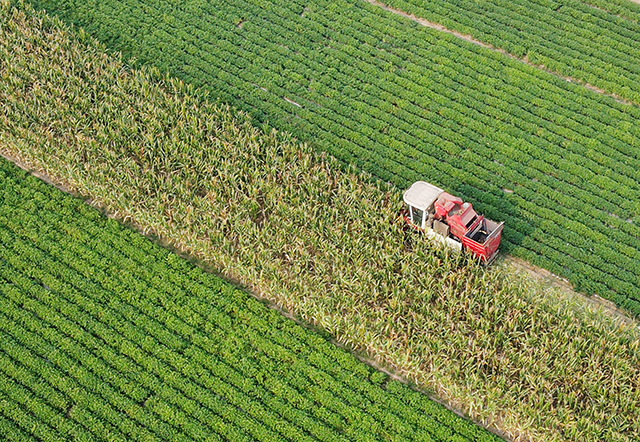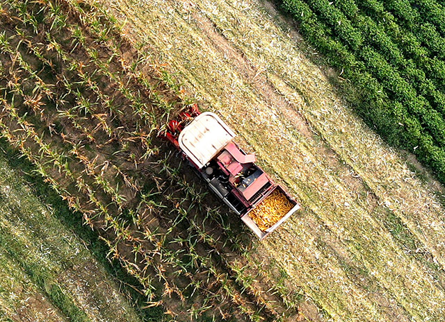 9月13日,收割机在青州市黄楼街道大陈村农田里收获玉米。