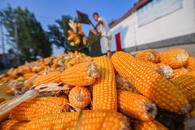 仲秋时节,青州市农田里种植的玉米陆续成熟,农民加紧收获、晾晒,确保颗粒归仓。(王继林 摄影)