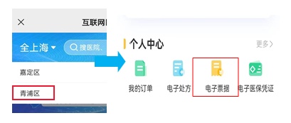 打开“健康云”微信公众号/或APP,点击“互联网医院”-“青浦区”-“个人中心”-“电子票据”,选择需要的医疗电子票据查看并保存。