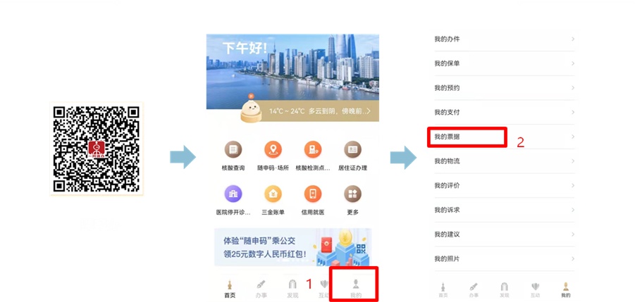 打开随申办,点击:“我的”-“我的票据”(建议24小时后查询)