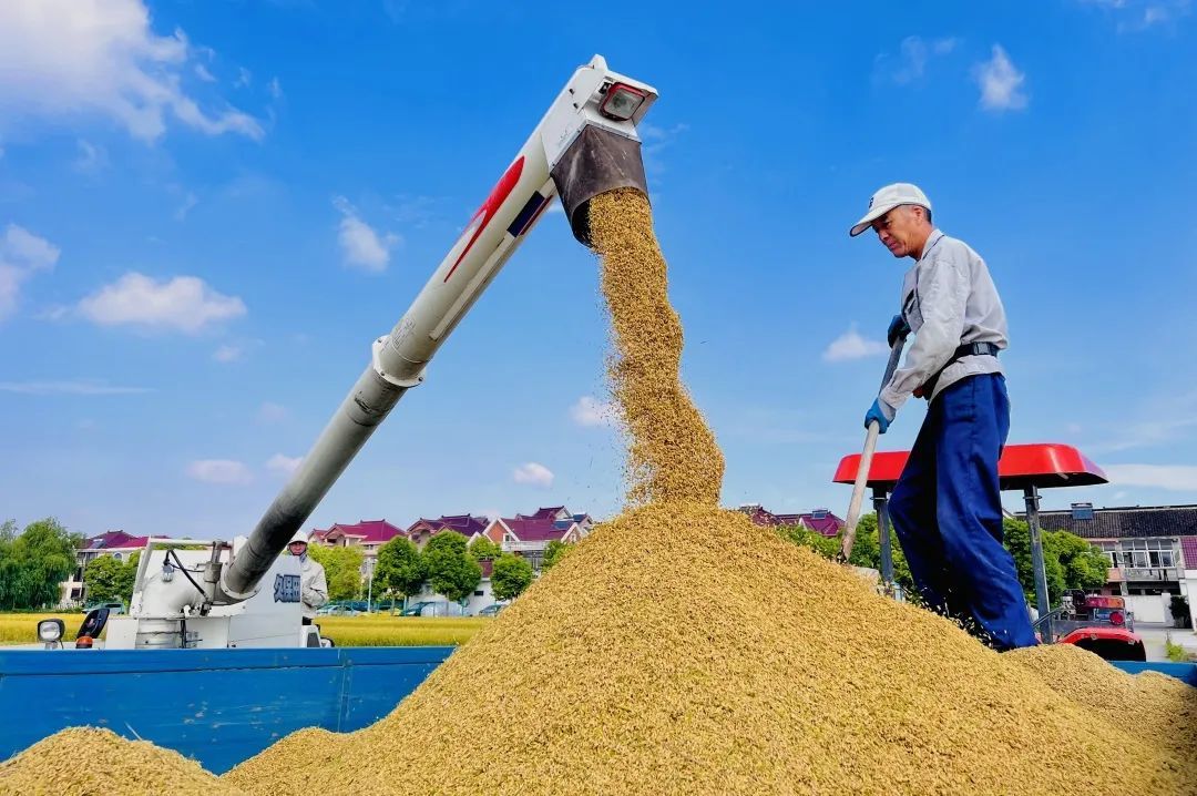 清晨,罗泾镇潘桥村何家宅的水稻田里一片繁忙的景象。伴随着收割机的轰鸣声,大片金黄色的稻田里,飘散起阵阵清新的稻香。农机手驾驶着收割机来回穿梭于稻田之中,割稻、脱粒、吐秆一气呵成,忙得热火朝天。不一会儿,板车便装满了小山一样的金黄稻谷。