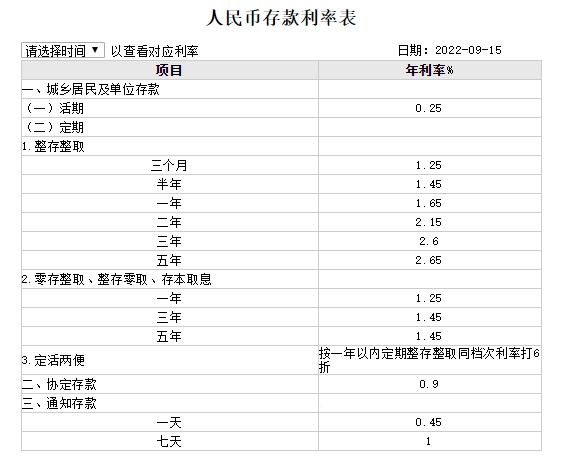 建设银行APP公布的挂牌年利率显示,9月15日,3个月、6个月、1年期、2年期、5年期定期存款利率分别为1.25%、1.45%、1.65%、2.15%、2.65%,均下降10个基点;3年期定期存款利率为2.60%,下调15个基点。