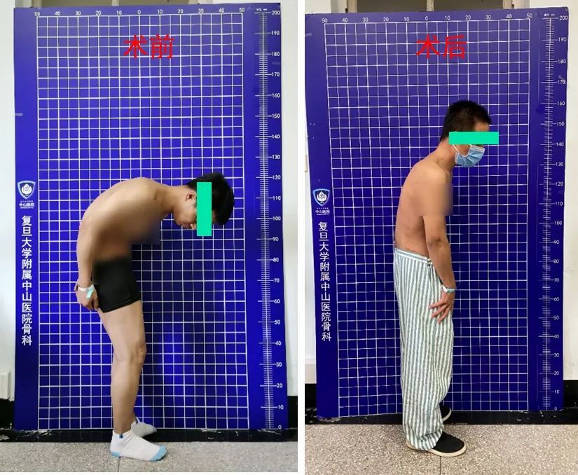 35岁的小刘被“强直性脊柱炎”折磨十余年,整个脊椎如“拧麻花”,身体呈“折叠”状态。2021年3月底、2022年8月底先后在中山医院骨科完成脊柱后凸畸形截骨矫形手术、髋关节置换手术两期手术后,他重新“挺直了”腰杆,康复出院。