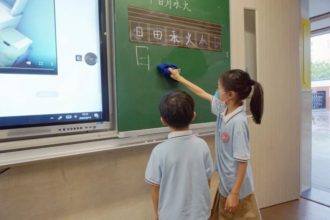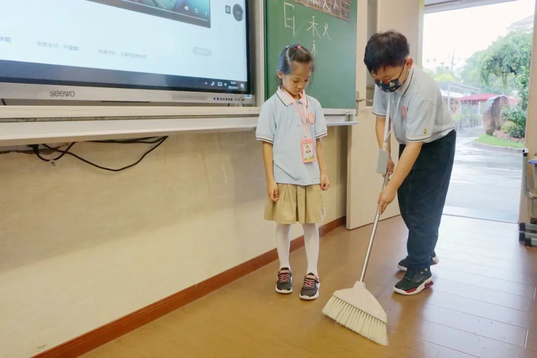 为此,学校开设劳动课,让二年级的小哥哥、小姐姐们带领小一新生一起打扫卫生,在提升孩子劳动意识、劳动能力的同时,也让二年级的学生发挥“小老师”的作用,帮助新生尽快融入小学生活。