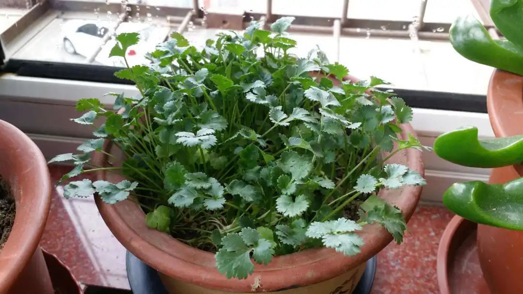 香菜为喜阴耐寒性植物,适宜较凉爽湿润的环境条件,因为有特殊气味,所以不招虫。香菜采用撒播方式,保证水分充足,1—2周即可出苗,成熟的时候可以挑选壮苗拔出食用。
