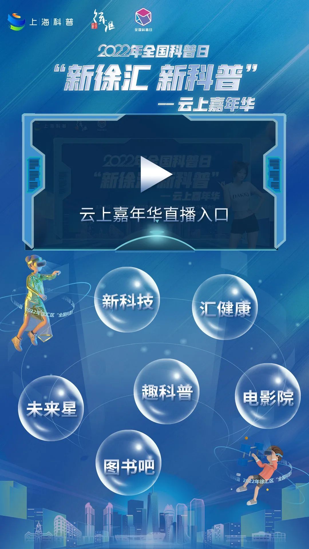2022年全国科普日“新徐汇 新科普”云上嘉年华云端平台,为您优选徐汇区最新优质科普资源,分布在云上直播、新科技、汇健康、趣科普、未来星、电影院、图书吧等7大版块,助您激发起科技创新的活力,带动青少年的科学兴趣,进一步提升全民的科学素养。