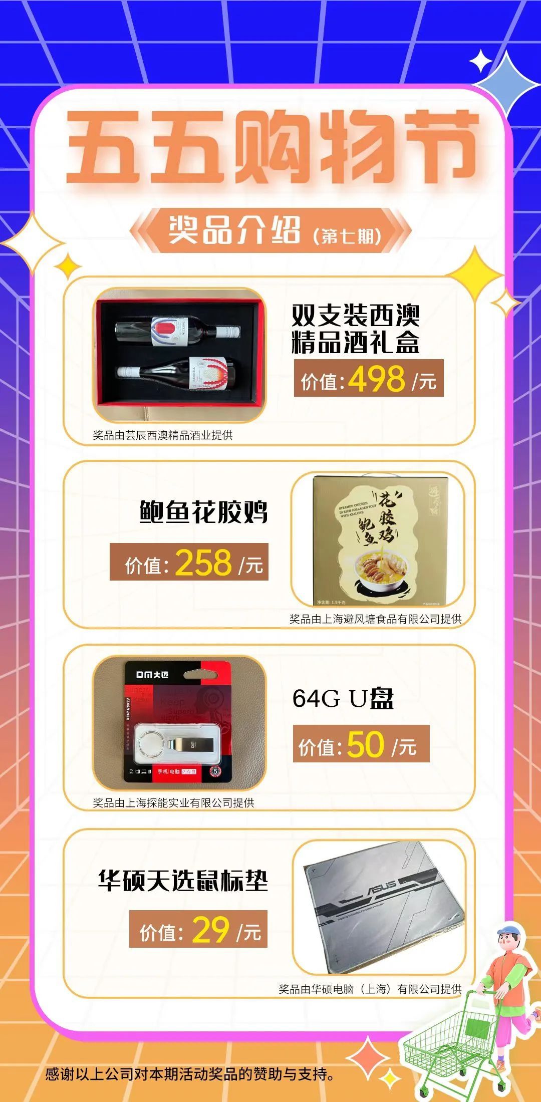感谢芸辰西澳精品酒业、上海避风塘食品有限公司、上海探能实业有限公司、华硕电脑(上海)有限公司对第七期活动奖品的赞助与支持。