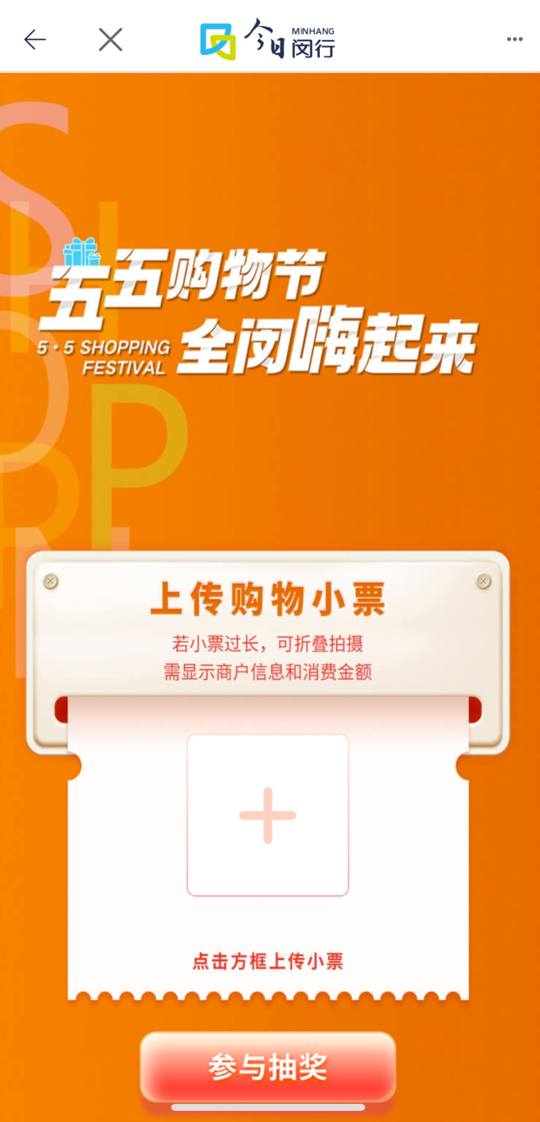 在8月5日-9月30日期间,用户在闵行区域内消费满55元所获得的购物小票/发票就是抽奖道具。