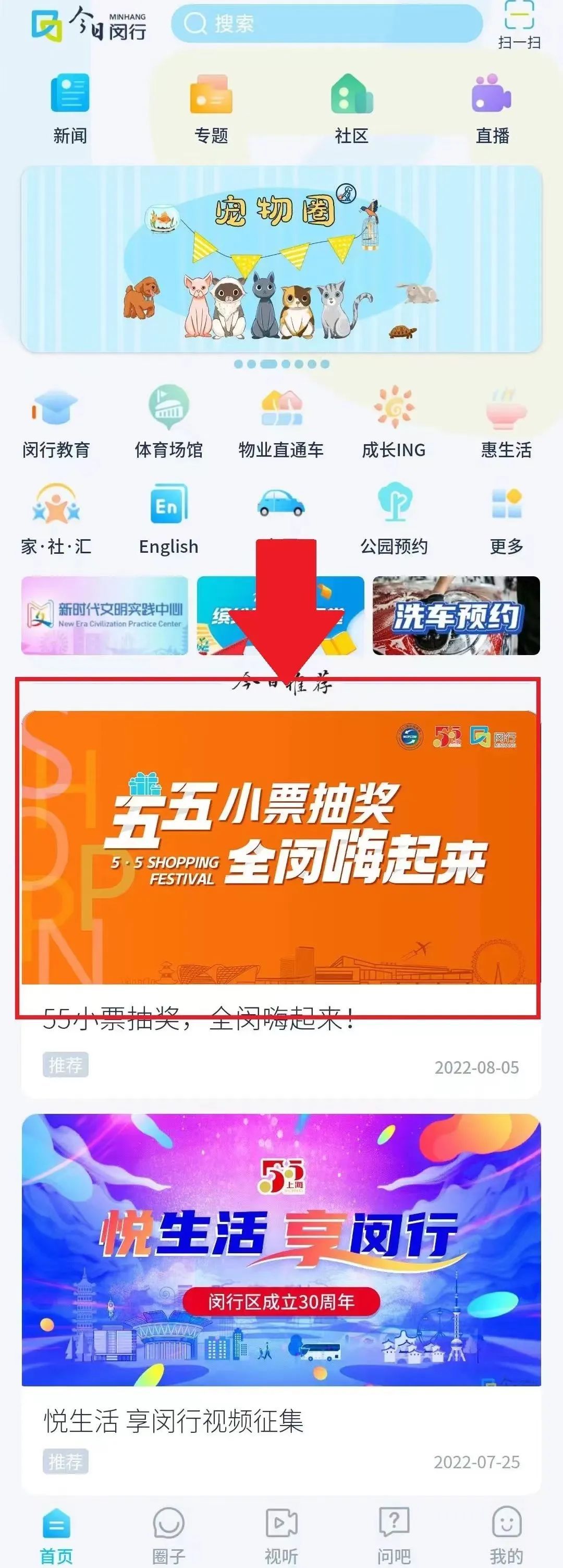 2.点击首页【今日推荐】下方“55小票抽奖,全闵嗨起来”的图片,进入活动页面。第七期活动时间:9月17日-9月23日。