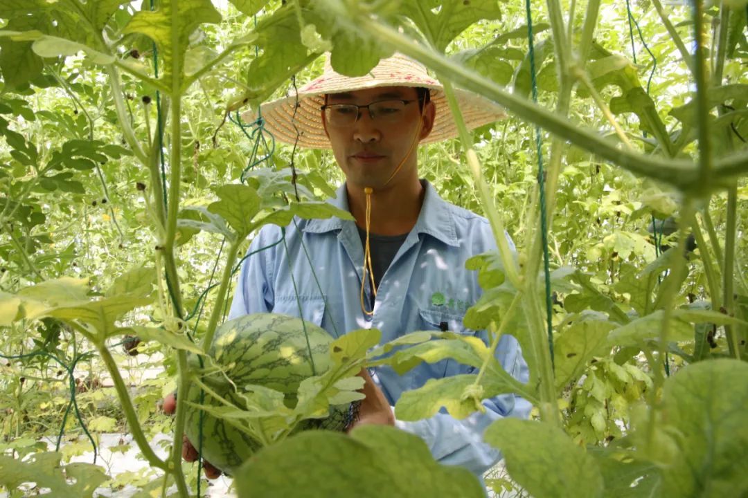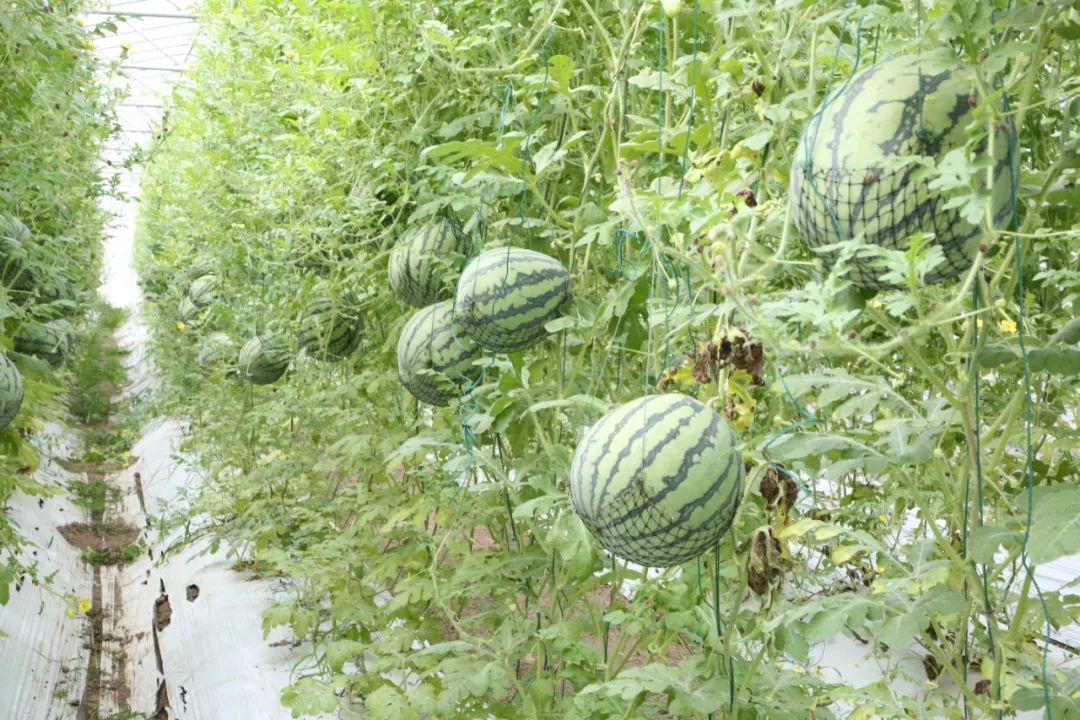 除了上市时间“独树一帜”,越夏瓜的栽种模式也和正常品种的西瓜有所不同。在试验站的大棚内,越夏西瓜一反“常态”,被网兜兜住,悬空生长。“悬空模式的空间利用率更高,可以节省土地面积,亩产量可达地爬种植的1.5倍以上,而且外观品质更好。”田甲玺介绍。