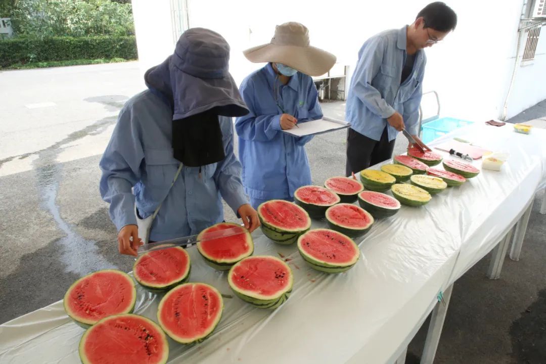 上午,在国家西甜瓜产业技术体系嘉定综合试验站内,农技人员正在对采收下来的越夏西瓜品种(组合)进行考种工作。只见农技人员对多个品种西瓜的果重、糖度、大小等情况分别进行统计。“目前这几批成熟越夏西瓜的品质,基本可以和春季栽种的西瓜相媲美。”农艺师田甲玺看着成熟的越夏瓜高兴地说。统计发现,红瓤中果型组合“681691”以及黄瓤小果型组合“604605”表现良好,西瓜中心的糖度基本都达到12度以上。“红瓤中果果型比较正,产量跟春天栽种的西瓜相差不多,单果重达4公斤左右。还有一个黄瓤小果型西瓜,这时候在市场上是看不到的,所以比较稀缺。”对于这两个西瓜品种(组合)的市场前景,田甲玺信心满满。