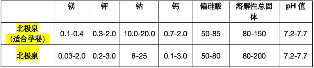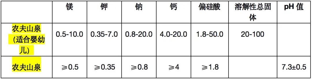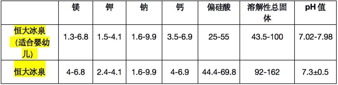 以下为相同品牌标注婴幼儿适用与未标注婴幼儿适用水的成分含量。