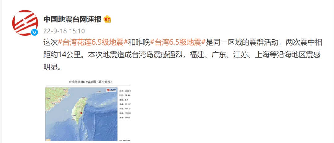 9月18日14时44分在台湾花莲县(北纬23.15度,东经121.30度)发生6.9级地震,震源深度10千米。