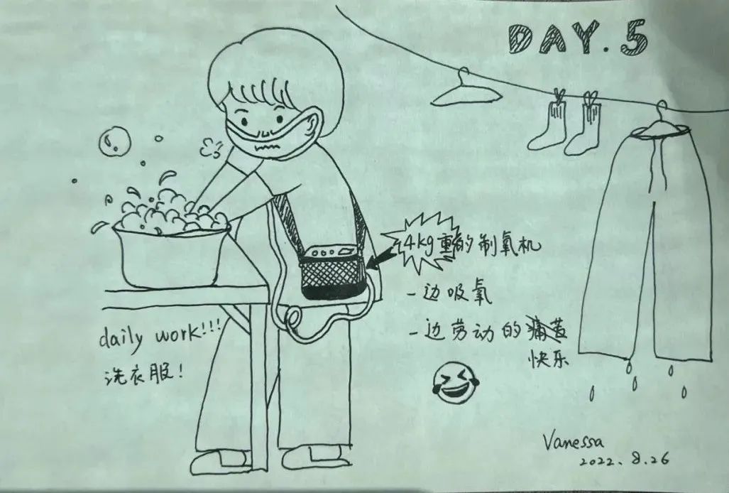 可一旦开展体力劳动,比如换洗衣服这种在平原地区还比较轻松的活,强烈的高反依然让林茵感觉很吃力。作为每天的日常之一,林茵每天都要背着8斤重的制氧机,一边吸氧,一边洗衣服。